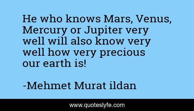 This page presents the quote "He who knows Mars, Venus, Mercury or Jupiter very well will also know very well how very precious our earth is!". Author of this quote is Mehmet Murat ildan. .