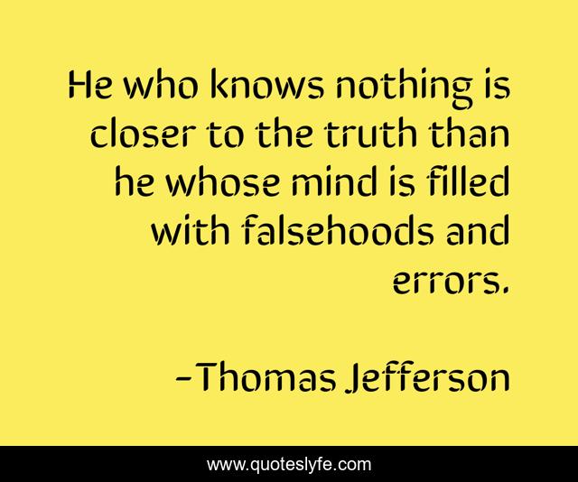 This page presents the quote "He who knows nothing is closer to the truth than he whose mind is filled with falsehoods and errors.". Author of this quote is Thomas Jefferson. This quote is about nothing, mind, truth,.
