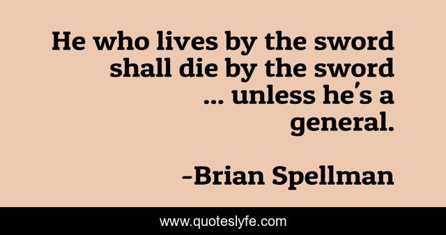 This page presents the quote "He who lives by the sword shall die by the sword ... unless he's a general.". Author of this quote is Brian Spellman. This quote is about military, patriotism, militarism,.
