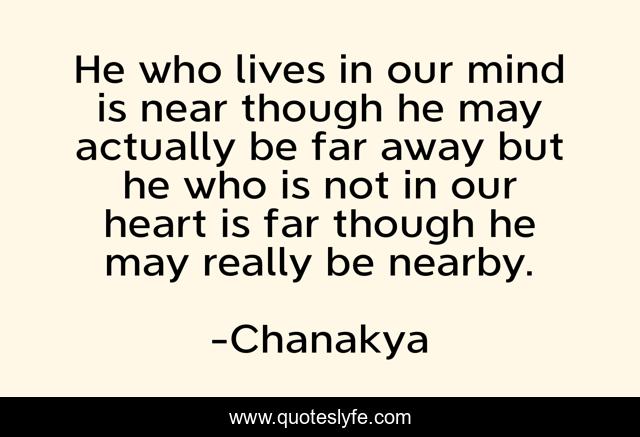 This page presents the quote "He who lives in our mind is near though he may actually be far away but he who is not in our heart is far though he may really be nearby.". Author of this quote is Chanakya. This quote is about heart, mind, far away,.