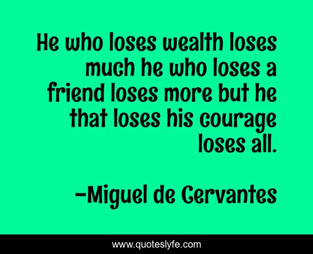This page presents the quote "He who loses wealth loses much he who loses a friend loses more but he that loses his courage loses all.". Author of this quote is Miguel de Cervantes. This quote is about wealth, friend, more,.