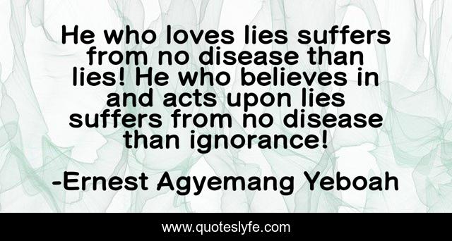 This page presents the quote "He who loves lies suffers from no disease than lies! He who believes in and acts upon lies suffers from no disease than ignorance!". Author of this quote is Ernest Agyemang Yeboah. This quote is about lies, humor, ignorance, lying,.