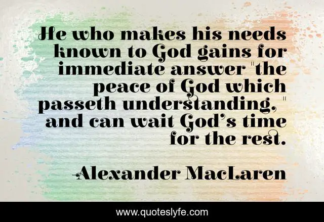 This page presents the quote "He who makes his needs known to God gains for immediate answer "the peace of God which passeth understanding, " and can wait God’s time for the rest.". Author of this quote is Alexander MacLaren. .