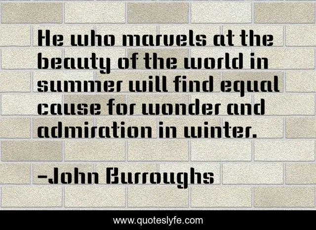 This page presents the quote "He who marvels at the beauty of the world in summer will find equal cause for wonder and admiration in winter.". Author of this quote is John Burroughs. This quote is about world, winter, summer,.