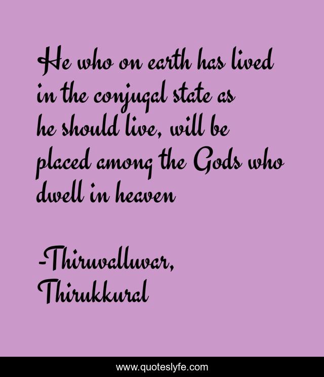 This page presents the quote "He who on earth has lived in the conjugal state as he should live, will be placed among the Gods who dwell in heaven". Author of this quote is Thiruvalluvar, Thirukkural. This quote is about faith, heaven, love, god, live, moral, virtue, earth, affection,.