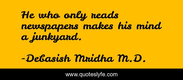 This page presents the quote "He who only reads newspapers makes his mind a junkyard.". Author of this quote is Debasish Mridha M.D.. This quote is about junkyard-of-a-mind, newspapers, philosophy, debasish-mridha, quotes, inspirational, enthusiasm, education, debasish-mridha-m-d,.
