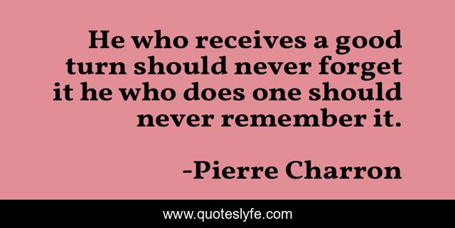 This page presents the quote "He who receives a good turn should never forget it he who does one should never remember it.". Author of this quote is Pierre Charron. .