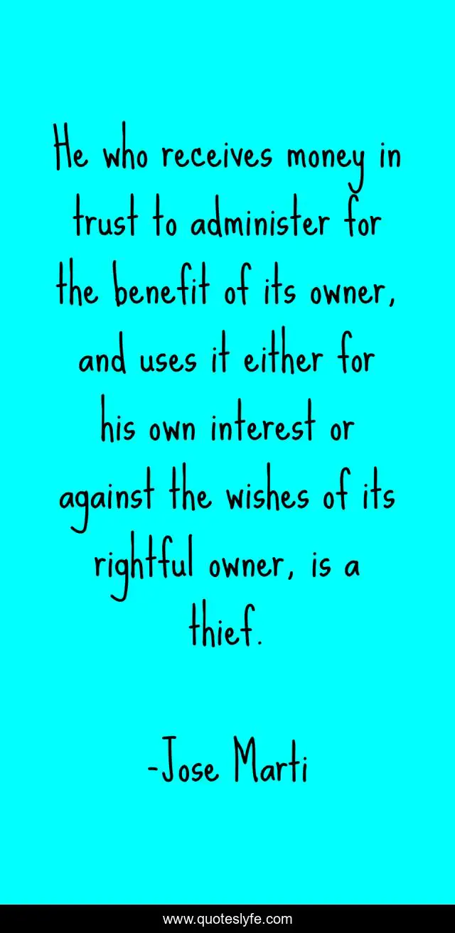 This page presents the quote "He who receives money in trust to administer for the benefit of its owner, and uses it either for his own interest or against the wishes of its rightful owner, is a thief.". Author of this quote is Jose Marti. This quote is about money, wishes, interest,.