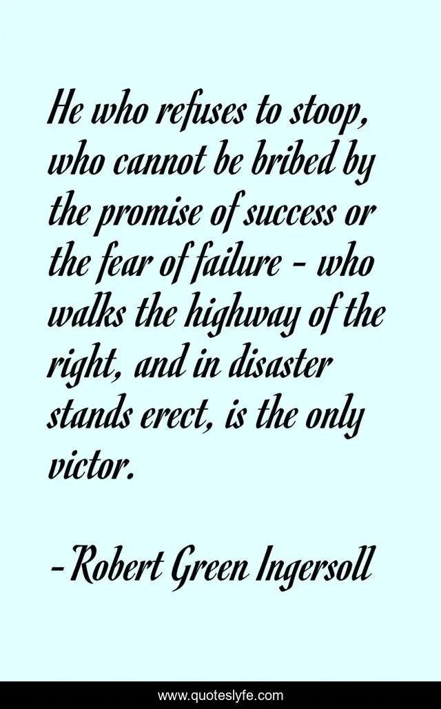 This page presents the quote "He who refuses to stoop, who cannot be bribed by the promise of success or the fear of failure - who walks the highway of the right, and in disaster stands erect, is the only victor.". Author of this quote is Robert Green Ingersoll. This quote is about fear, disaster, success,.