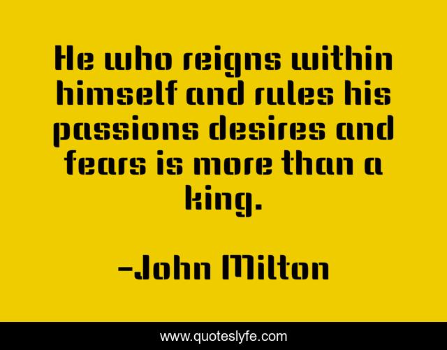 This page presents the quote "He who reigns within himself and rules his passions desires and fears is more than a king.". Author of this quote is John Milton. This quote is about control, self,.