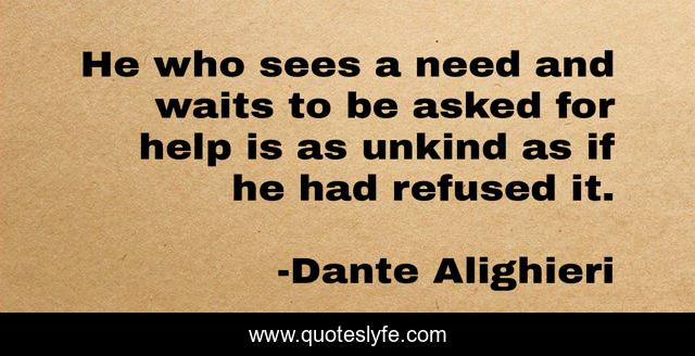 This page presents the quote "He who sees a need and waits to be asked for help is as unkind as if he had refused it.". Author of this quote is Dante Alighieri. This quote is about kindness, help,.