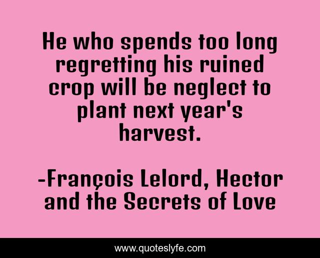 This page presents the quote "He who spends too long regretting his ruined crop will be neglect to plant next year's harvest.". Author of this quote is François Lelord, Hector and the Secrets of Love. This quote is about life, novel, hector, thoughtful, inspirational, life-changing, enthusiasm,.