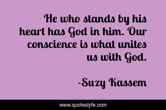 This page presents the quote "He who stands by his heart has God in him. Our conscience is what unites us with God.". Author of this quote is Suzy Kassem. This quote is about conscience, faith, right, standing-up, doing-right, god, conscience-and-attitude, creator, connects,.
