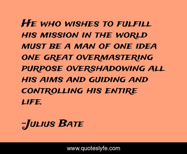 This page presents the quote "He who wishes to fulfill his mission in the world must be a man of one idea one great overmastering purpose overshadowing all his aims and guiding and controlling his entire life.". Author of this quote is Julius Bate. .