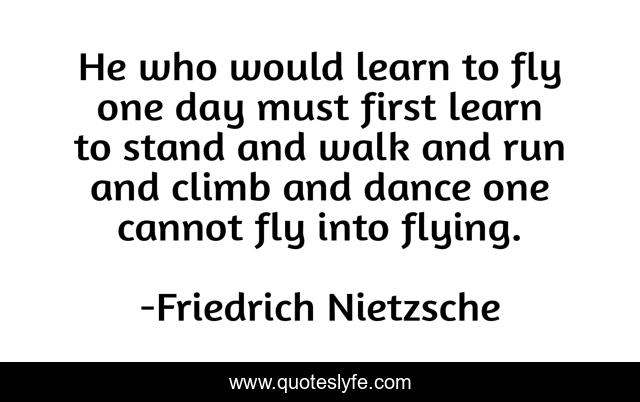 This page presents the quote "He who would learn to fly one day must first learn to stand and walk and run and climb and dance one cannot fly into flying.". Author of this quote is Friedrich Nietzsche. .