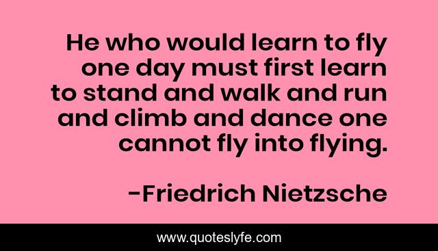 This page presents the quote "He who would learn to fly one day must first learn to stand and walk and run and climb and dance one cannot fly into flying.". Author of this quote is Friedrich Nietzsche. This quote is about dance, day, walk,.