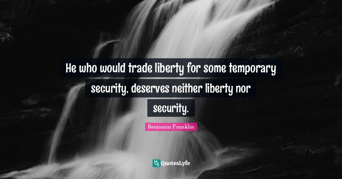 This page presents the quote "He who would trade liberty for some temporary security, deserves neither liberty nor security.". Author of this quote is Benjamin Franklin. This quote is about trade, temporary, politics, security, conservative, liberty,.