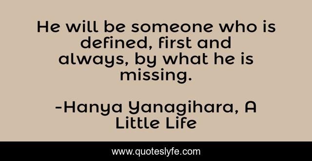 This page presents the quote "He will be someone who is defined, first and always, by what he is missing.". Author of this quote is Hanya Yanagihara, A Little Life. This quote is about missing, a-little-life, hanya-yanagihara, sad,.