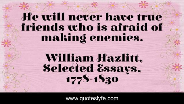 This page presents the quote "He will never have true friends who is afraid of making enemies.". Author of this quote is William Hazlitt, Selected Essays, 1778-1830. This quote is about fear, afraid, friendship, enemies,.