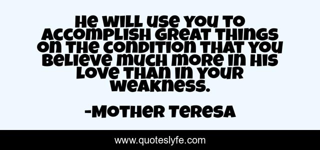 This page presents the quote "He will use you to accomplish great things on the condition that you believe much more in His love than in your weakness.". Author of this quote is Mother Teresa. .