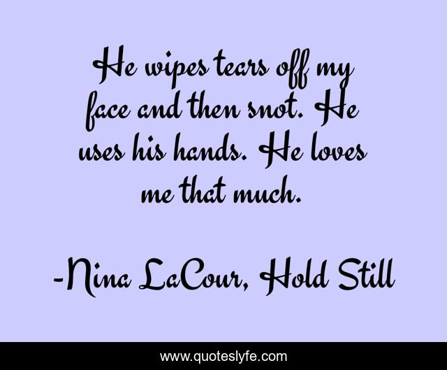 "Nina LaCour, Hold Still Quotes." Quoteslyfe.com, 2025. Sat. 06 Dec. 2025. <https://www.quoteslyfe.com/quote/He-wipes-tears-off-my-face-and-21005>.