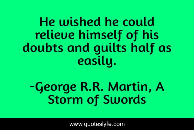 This page presents the quote "He wished he could relieve himself of his doubts and guilts half as easily.". Author of this quote is George R.R. Martin, A Storm of Swords. This quote is about doubt, guilt, feelings,.
