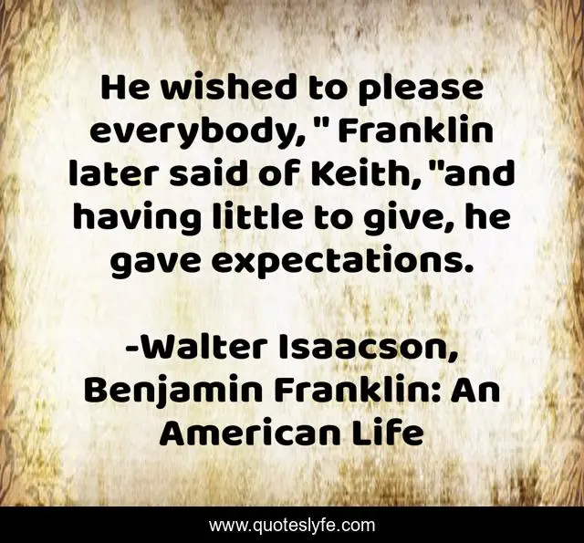 This page presents the quote "He wished to please everybody, " Franklin later said of Keith, "and having little to give, he gave expectations.". Author of this quote is Walter Isaacson, Benjamin Franklin: An American Life. .