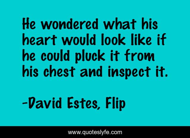 This page presents the quote "He wondered what his heart would look like if he could pluck it from his chest and inspect it.". Author of this quote is David Estes, Flip. This quote is about anger, heart, heartbreak, loss-of-innocence, loss,.