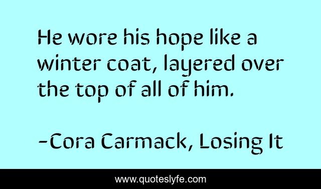 This page presents the quote "He wore his hope like a winter coat, layered over the top of all of him.". Author of this quote is Cora Carmack, Losing It. This quote is about amazing-writing, hope,.