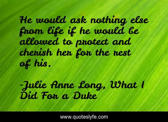 This page presents the quote "He would ask nothing else from life if he would be allowed to protect and cherish her for the rest of his.". Author of this quote is Julie Anne Long, What I Did For a Duke. This quote is about romance, pennyroyal,.
