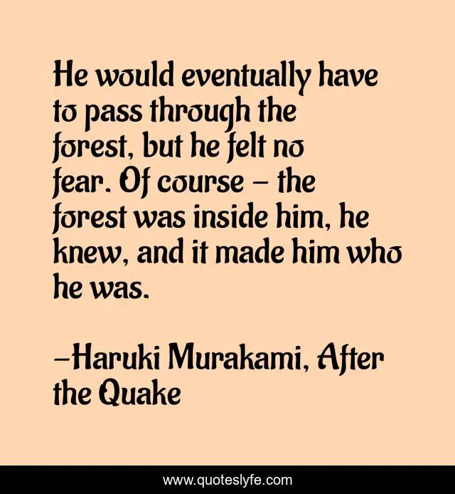 This page presents the quote "He would eventually have to pass through the forest, but he felt no fear. Of course - the forest was inside him, he knew, and it made him who he was.". Author of this quote is Haruki Murakami, After the Quake. This quote is about life, fear-in-life, life-lesson, forest-metaphor, dealing-with-fear, forest, fear, life-is-like-a-forest, reassurance,.