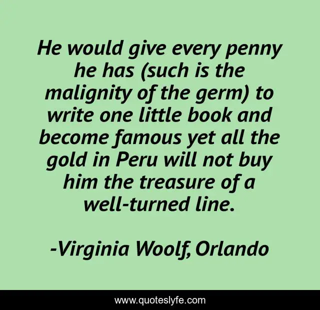 This page presents the quote "He would give every penny he has (such is the malignity of the germ) to write one little book and become famous yet all the gold in Peru will not buy him the treasure of a well-turned line.". Author of this quote is Virginia Woolf, Orlando. .