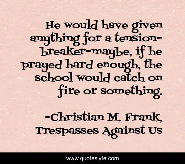 This page presents the quote "He would have given anything for a tension-breaker-maybe, if he prayed hard enough, the school would catch on fire or something.". Author of this quote is Christian M. Frank, Trespasses Against Us. This quote is about fire, tension, humor, prayer,.