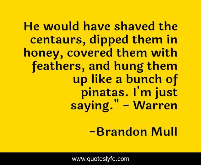 This page presents the quote "He would have shaved the centaurs, dipped them in honey, covered them with feathers, and hung them up like a bunch of pinatas. I'm just saying." - Warren". Author of this quote is Brandon Mull. This quote is about funny, humor, centaurs, patton, burgess, comedy, warren,.