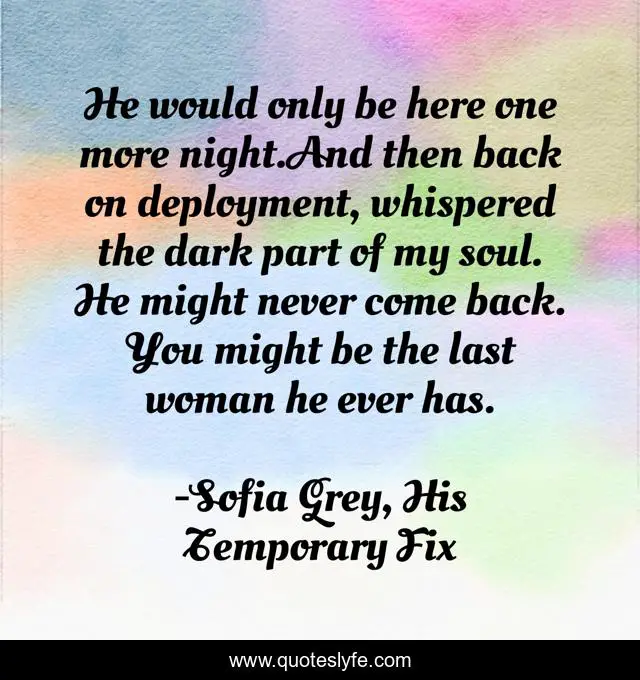 This page presents the quote "He would only be here one more night.And then back on deployment, whispered the dark part of my soul. He might never come back. You might be the last woman he ever has.". Author of this quote is Sofia Grey, His Temporary Fix. This quote is about grief, military, contemporary-romance,.