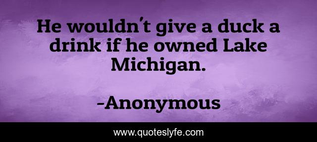 This page presents the quote "He wouldn't give a duck a drink if he owned Lake Michigan.". Author of this quote is Anonymous. This quote is about quips, comments,.