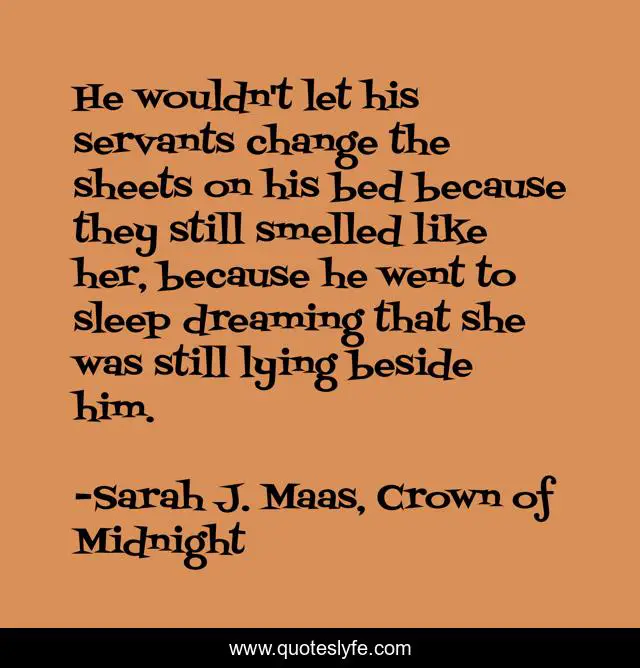 This page presents the quote "He wouldn't let his servants change the sheets on his bed because they still smelled like her, because he went to sleep dreaming that she was still lying beside him.". Author of this quote is Sarah J. Maas, Crown of Midnight. .