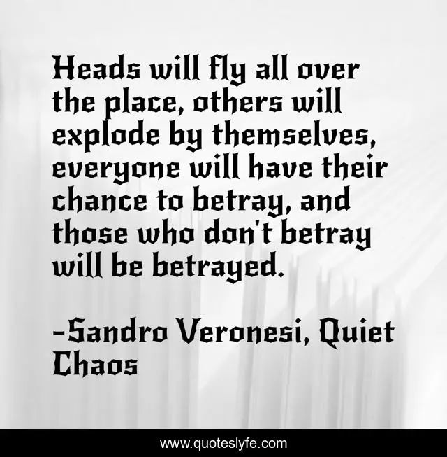 This page presents the quote "Heads will fly all over the place, others will explode by themselves, everyone will have their chance to betray, and those who don't betray will be betrayed.". Author of this quote is Sandro Veronesi, Quiet Chaos. This quote is about life-and-living, truth, inspiration,.