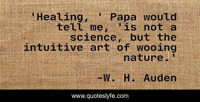 This page presents the quote "'Healing, ' Papa would tell me, 'is not a science, but the intuitive art of wooing nature.'". Author of this quote is W. H. Auden. This quote is about science, art, healing,.