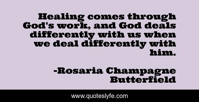 This page presents the quote "Healing comes through God's work, and God deals differently with us when we deal differently with him.". Author of this quote is Rosaria Champagne Butterfield. This quote is about god, heal, healing, christianity,.
