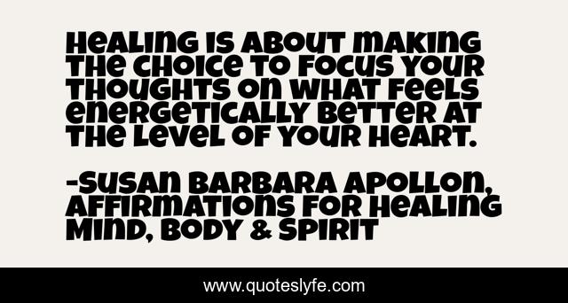 "Susan Barbara Apollon, Affirmations for Healing Mind, Body & Spirit Quotes." Quoteslyfe.com, 2025. Sun. 07 Dec. 2025. <https://www.quoteslyfe.com/quote/Healing-is-about-making-the-choice-to-114626>.