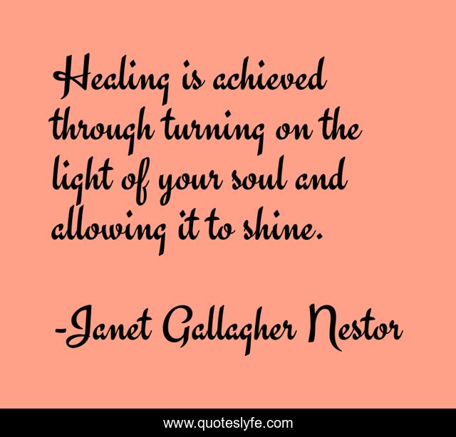 This page presents the quote "Healing is achieved through turning on the light of your soul and allowing it to shine.". Author of this quote is Janet Gallagher Nestor. This quote is about mindfulness, wellness, well-being, healing, self-help, awareness,.