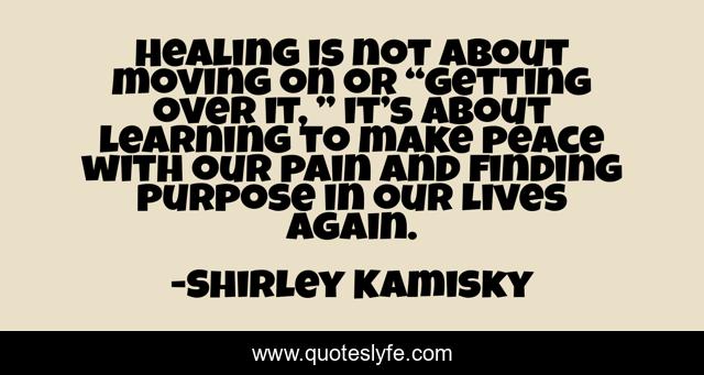This page presents the quote "Healing is not about moving on or “getting over it, ” it’s about learning to make peace with our pain and finding purpose in our lives again.". Author of this quote is Shirley Kamisky. This quote is about suicide-loss, loss, suicide, getting-over-it, suicide-survivors, healing-the-past, grief, healing-insights, healing,.