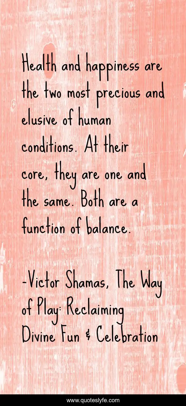 This page presents the quote "Health and happiness are the two most precious and elusive of human conditions. At their core, they are one and the same. Both are a function of balance.". Author of this quote is Victor Shamas, The Way of Play: Reclaiming Divine Fun & Celebration. This quote is about spiritual, spirituality, health, balance, spirit, happiness,.