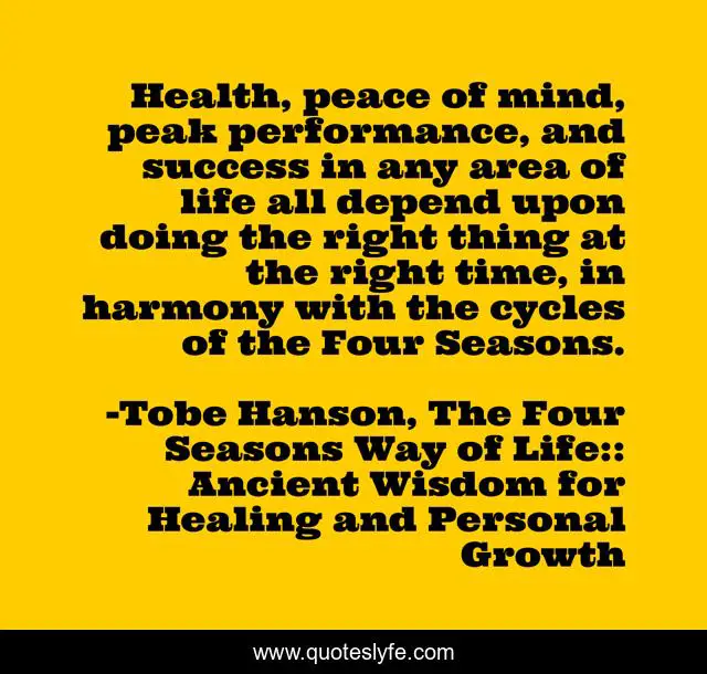 "Tobe Hanson, The Four Seasons Way of Life:: Ancient Wisdom for Healing and Personal Growth Quotes." Quoteslyfe.com, 2025. Sat. 06 Dec. 2025. <https://www.quoteslyfe.com/quote/Health-peace-of-mind-peak-performance-and-13496>.