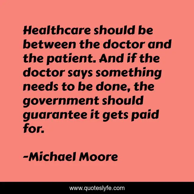 This page presents the quote "Healthcare should be between the doctor and the patient. And if the doctor says something needs to be done, the government should guarantee it gets paid for.". Author of this quote is Michael Moore. This quote is about doctor, done, healthcare,.