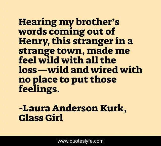This page presents the quote "Hearing my brother’s words coming out of Henry, this stranger in a strange town, made me feel wild with all the loss—wild and wired with no place to put those feelings.". Author of this quote is Laura Anderson Kurk, Glass Girl. This quote is about glass-girl, laura-anderson-kurk, teen-books, ya, meg-kavanagh, ya-fiction, grief, romance, henry-whitmire,.