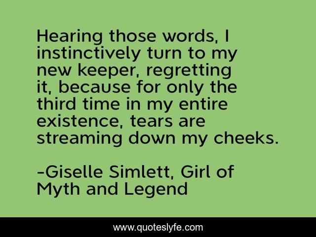 This page presents the quote "Hearing those words, I instinctively turn to my new keeper, regretting it, because for only the third time in my entire existence, tears are streaming down my cheeks.". Author of this quote is Giselle Simlett, Girl of Myth and Legend. This quote is about tears, crying,.