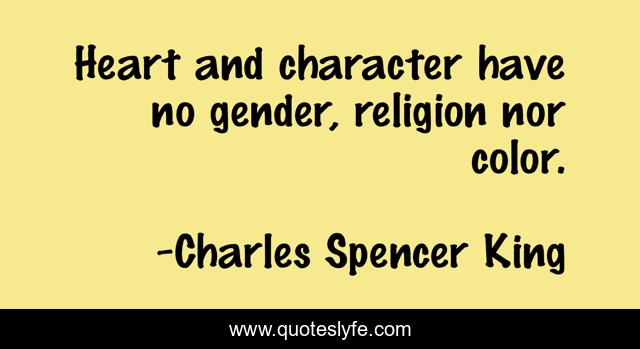 This page presents the quote "Heart and character have no gender, religion nor color.". Author of this quote is Charles Spencer King. This quote is about gender, race, character,.