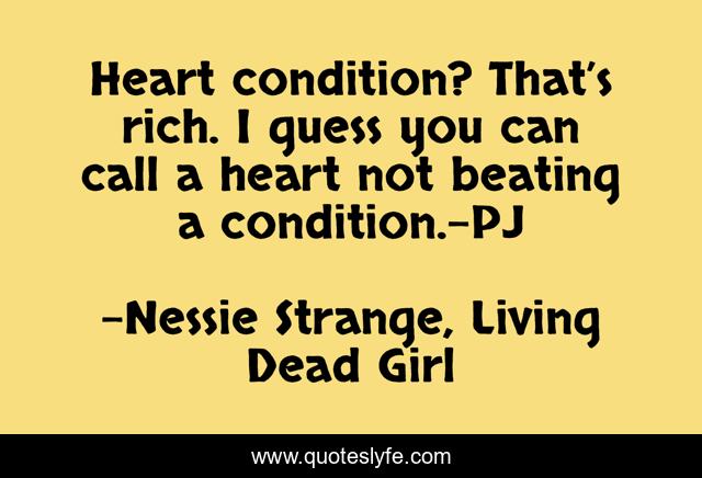 This page presents the quote "Heart condition? That’s rich. I guess you can call a heart not beating a condition.-PJ". Author of this quote is Nessie Strange, Living Dead Girl. This quote is about dark-humor, best-friends, zombies,.